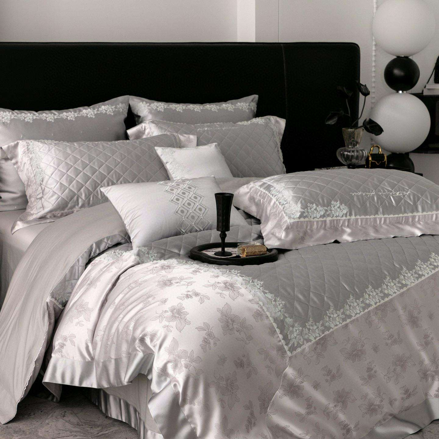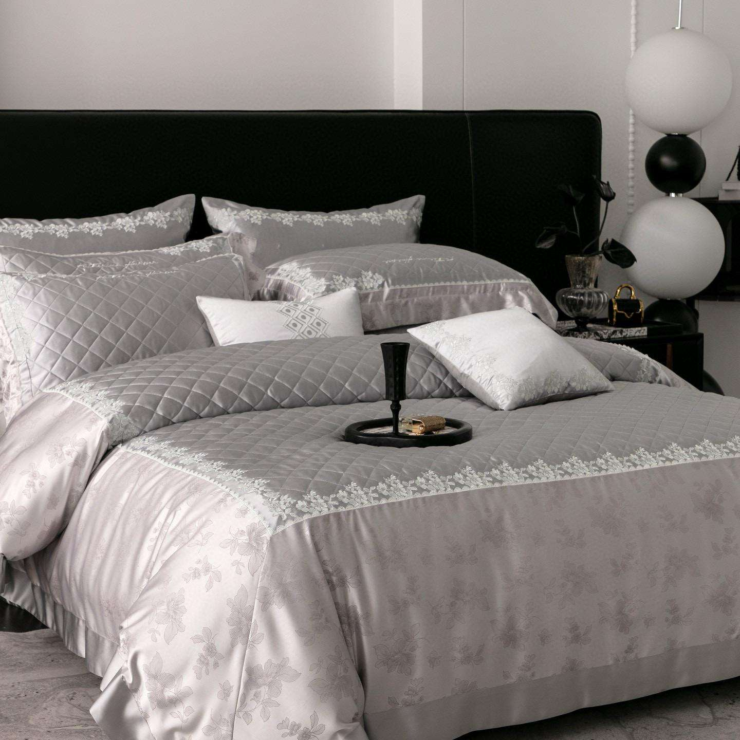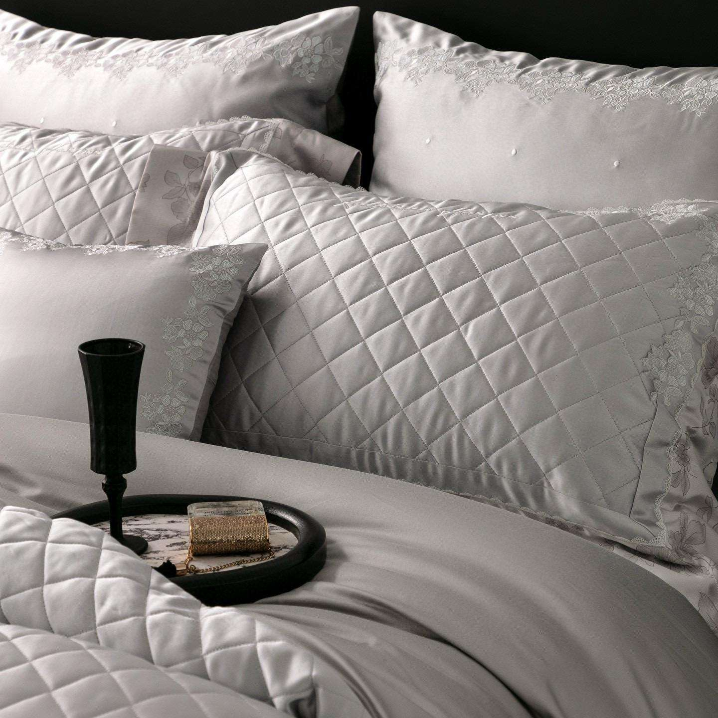 The centre panel of the duvet cover and pillows features precision diamond quilting.