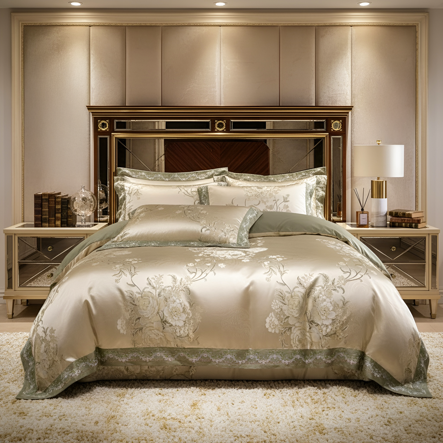 Cette magnifique parure de lit apporte une touche sans effort touche de luxe au décor de votre chambre avec un superbe satin "Champagne gris" base et motif damassé doré et bronze.