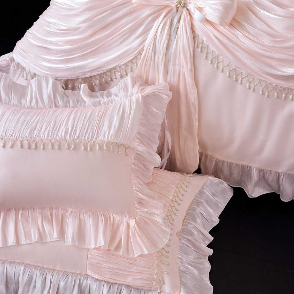 The romantic ruffle trim is elevated with delicate pearl embellishments and graceful draped bow accents, creating a truly luxurious statement piece.