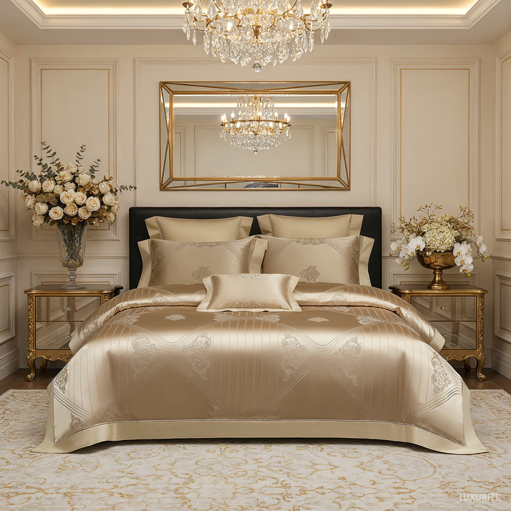 Этот выдающийся набор имеет потрясающий brocade узор, обогащающий элегантную золотую основу.