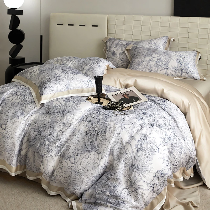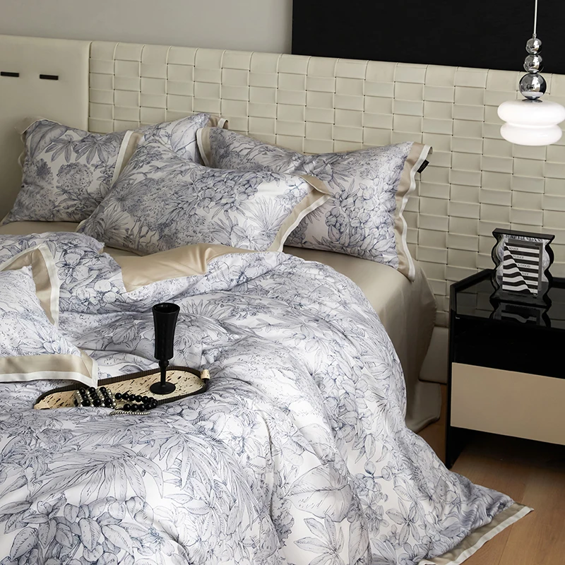 Нежные чернильно-синие и серые цветы, тонко напечатанные на белой ткани, добавляют нотку вечной элегантности, усиливая ощущение роскоши постельного белья. Мягкий шампанское-золотой кант и простыня дополняют разнообразные стили интерьера — от классики до современности, создавая спокойную и уютную атмосферу в вашей спальне.